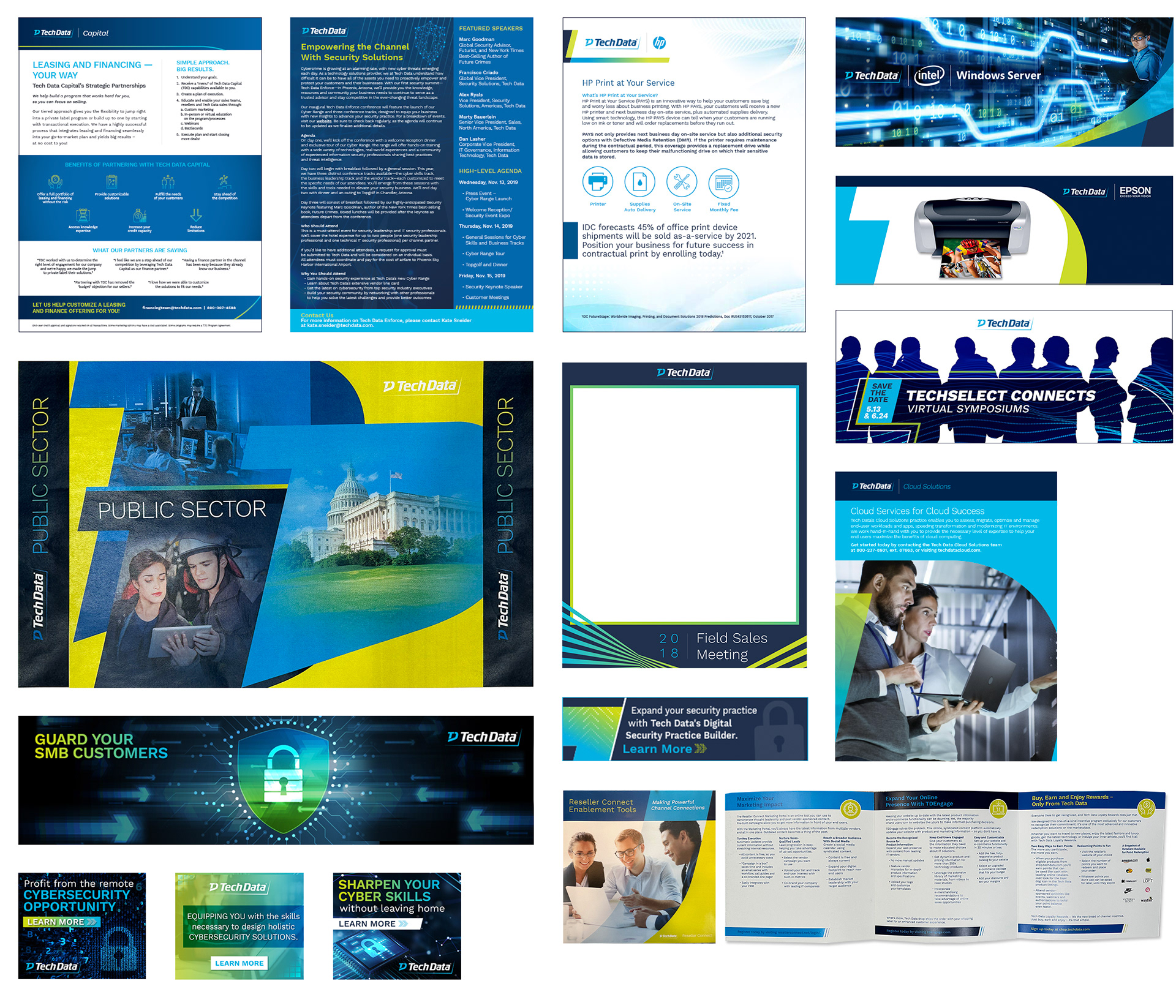 Tech Data rebrand which includes web and print materials for corporate, internal departments and vendor cobranding. Pieces shown are one pagers, email mastheads, trade show booth, photo booth frame, ad, landing page, web ads, e-signature and brochure.